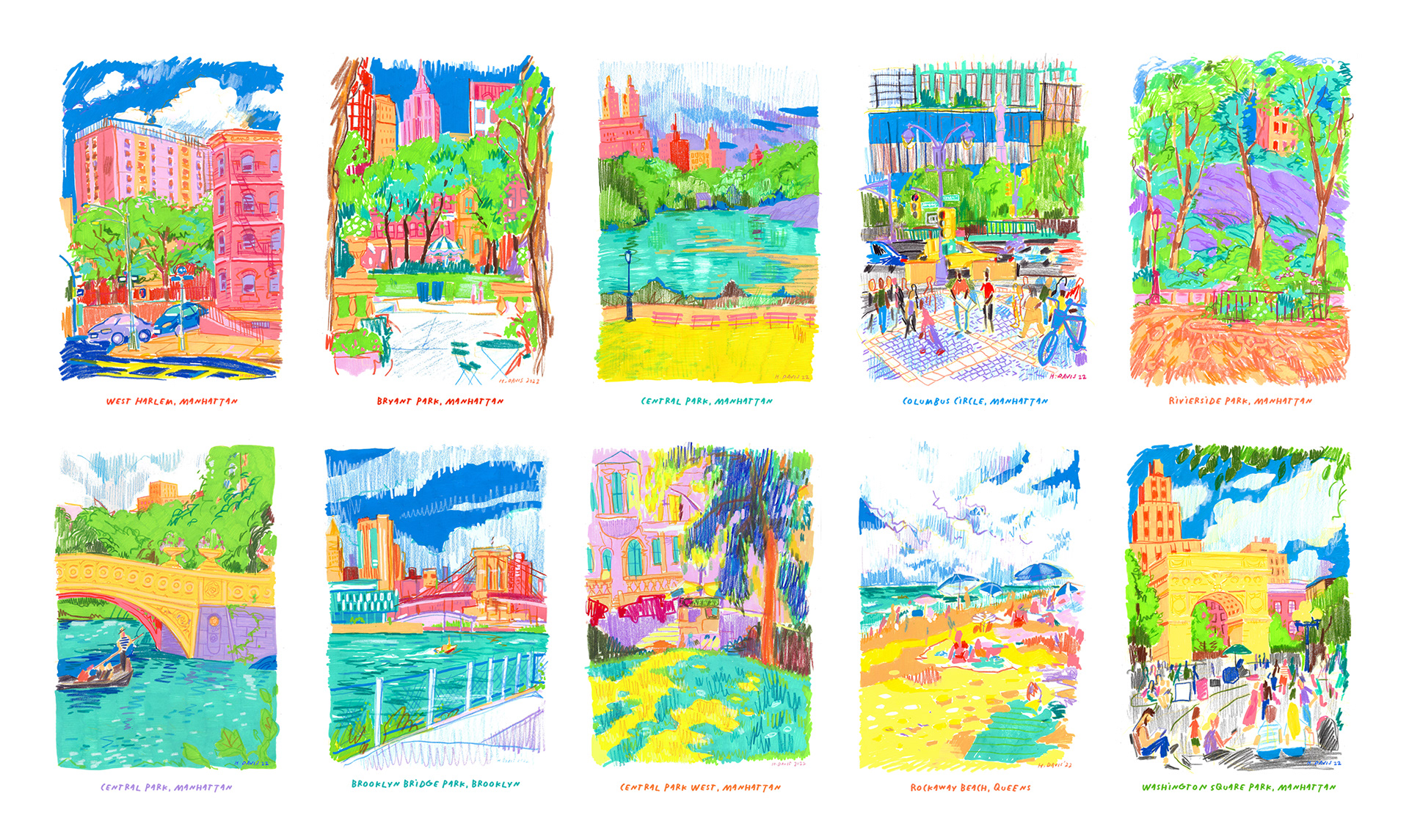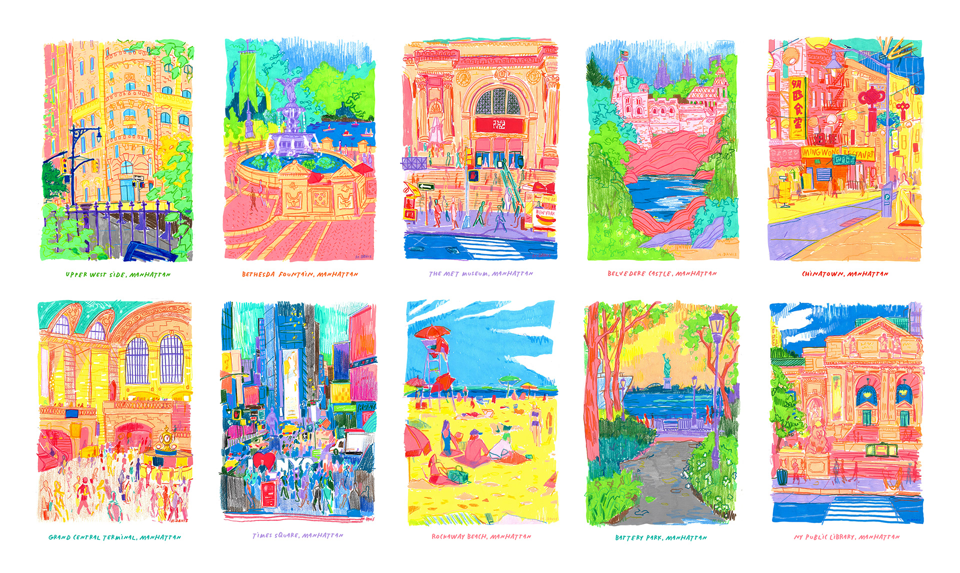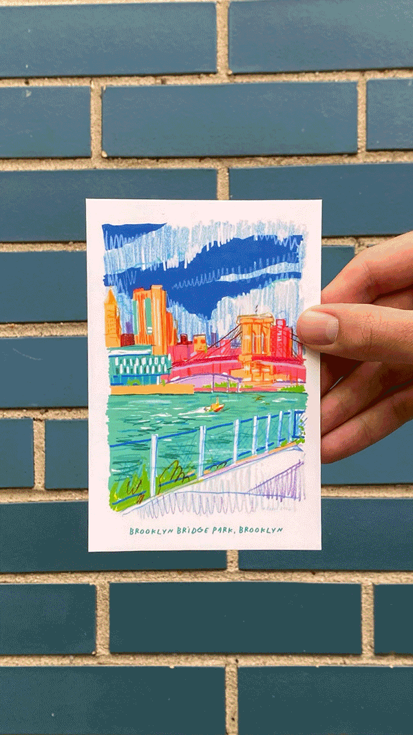 In the summer of 2022 I visited my favorite parts of the city and drew them with Posca paint markers and colored pencils. After creating a collection of 10, I framed and sold the original artworks and proceeded to make postcard print sets to sell. The collection did so well the next year, in 2023, I did a new set of 10 and another set of postcards. I submitted the artwork to LinkNYC, digital kiosks scattered around the city, and the drawings were featured there. I wanted to create artwork that was as colorful and full of life as the city I have grown to love.