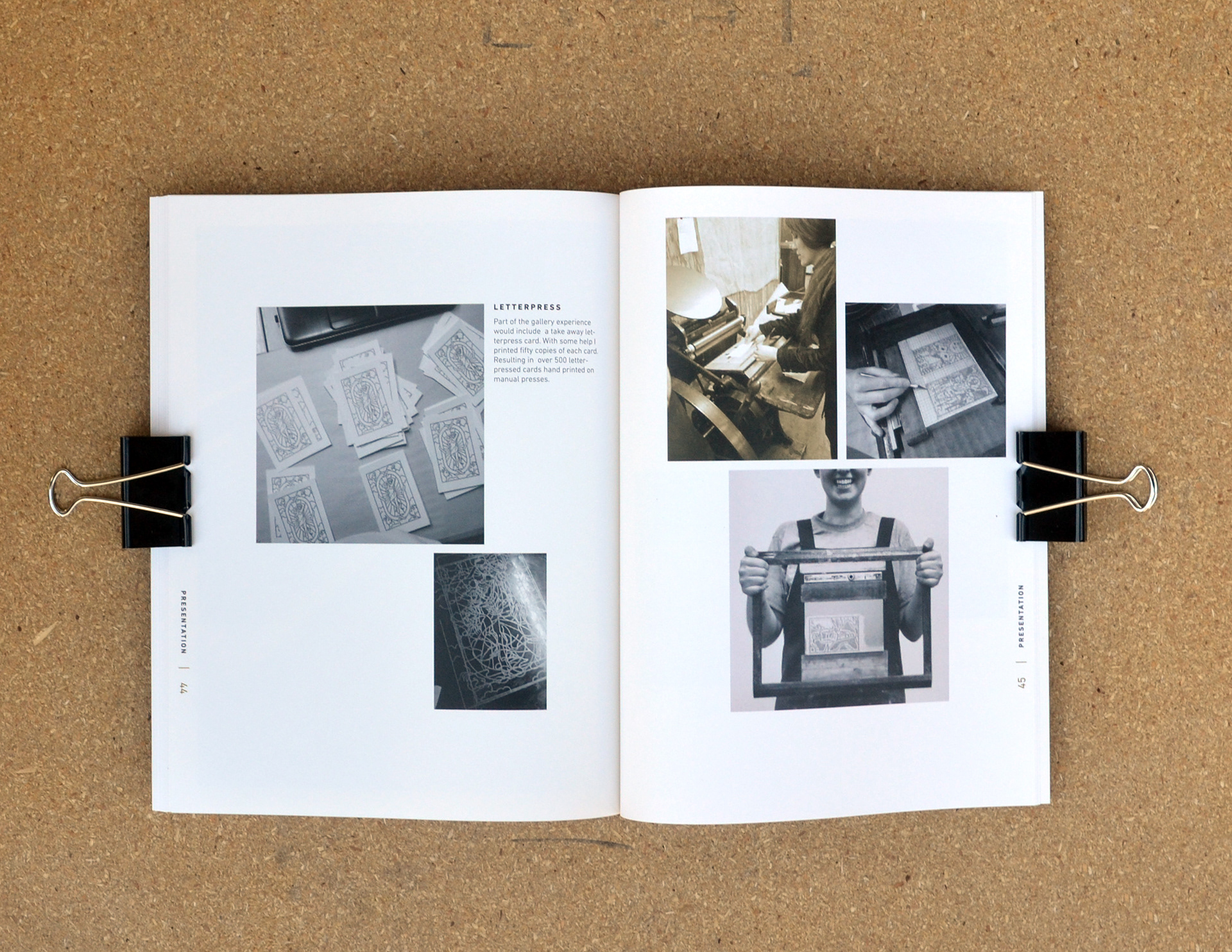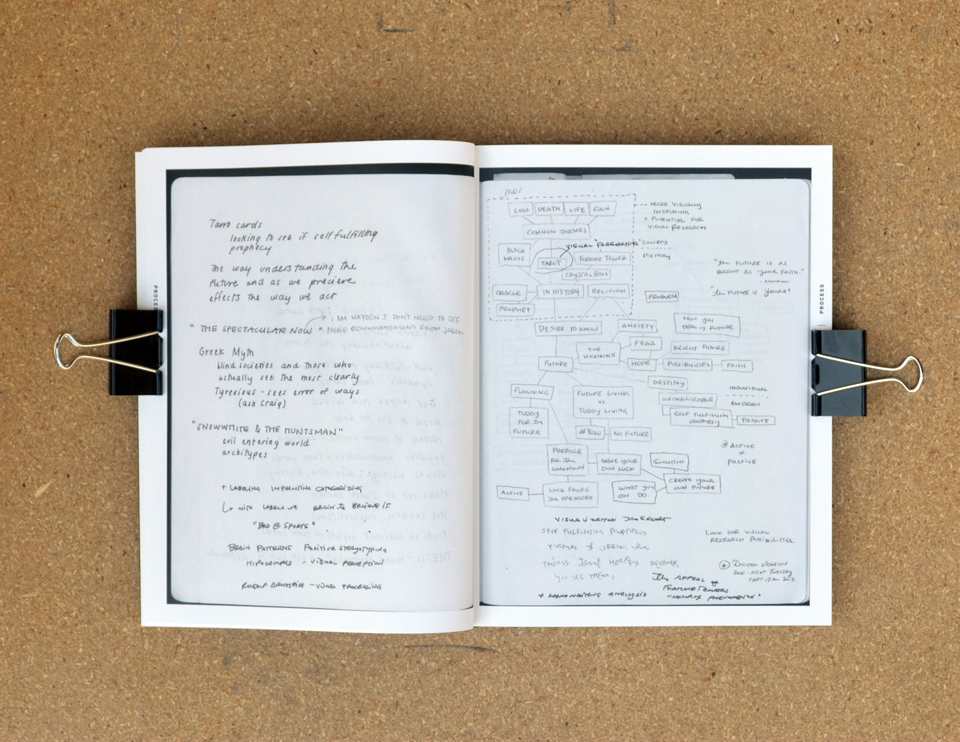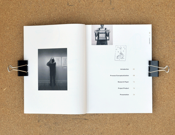 All process work, research, and documentation was collected in a process book. Over 50 pages divided into 5 sections: an Introduction, Process Work, the Research Paper, the Project Product, and Presentation. The book's cover was made from the same silk screened metallic prints as the posters in the show. Selected spreads are shown below.